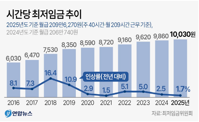 최저임금 인상률이 최근 몇 년간 높았지만, 이는 역대 두 번째로 낮은 인상률이다. 최저임금제가 도입된 이래 처음으로 금액이 1만원을 넘었다. 근로자대표 9명, 사용자대표 9명, 공익대표 9명으로 구성된 위원회는 하한 1만원, 상한 1만290원에 대한 의견을 냈고, 최종 투표는 이 금액의 결과였다. 내년 최저임금은 시급 1만30원, 월급 2,096,270원으로 올해보다 약 3만원이 높아진다. 물론 이는 세전 기준이므로 최근 국민연금 등의 인상을 고려하면 더욱 낮아질 것이다. 최저임금은 내년 1월 1일부터 적용된다. 최저임금을 위반하면 최대 3년의 징역 또는 최대 2,000만원의 벌금에 처할 수 있다. 최저임금과 식비의 관계 복날을 앞둔 삼계탕은 2만원대 중반이고, 냉면도 평균 1만원이 넘는다. 최근 몇 년간 식비 등 생계비가 오르면서 최저임금을 몇백원 올리는 것보다는 회사에서 음식이나 식사를 제공하는 게 더 나은 것 같다. 2023년 관련법이 개정되면서 월 1회 이상 지급되는 식비, 숙박비, 교통비 등 복리후생비와 정기적 보너스도 최저임금에 포함된다. 따라서 실질임금이 오히려 떨어지는 사례도 있어 이 부분에 대한 대책이 필요해 보인다. 한편으로는 최저임금 인상의 부담을 호소하는 자영업자도 있고, 무인매장과 AI로의 대체가 가속화될 것을 우려하는 자영업자도 있다. 의견이 너무 다양해서 쉬운 문제는 아니다.