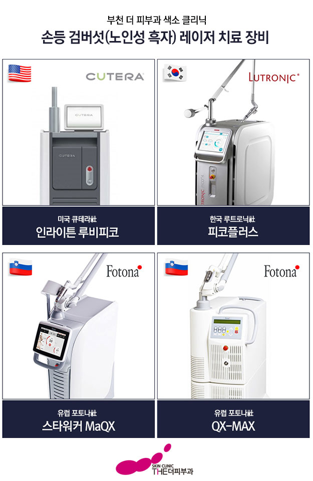 마이크로 레이저, 탄산가스 레이저, 어붐야 레이저, Q스위치 등 손등 기미 치료에 사용되는 레이저는 여러 종류가 있다. 그 중 많은 관심을 받고 있는 마이크로 레이저는 멜라닌 제거를 위해 2개의 파장을 내장하고 있으며, 피코초 레이저는 1초/나노초 펄스 폭으로 레이저를 조사함으로써 보다 빠르고 안전하게 멜라닌을 제거할 수 있다. 그러나 레이저 치료 시 가벼운 기미나 손등의 두꺼운 검버섯이 잘 제거되지 않거나 시술 후에도 홍반이나 과색소침착이 남을 수 있다는 우려가 있다. 게다가. 이러한 위험을 줄이고 보다 효과적으로 치료하기 위해서는 개별화된 복합 레이저 치료가 이루어지고 있는지 확인하는 것이 좋습니다.